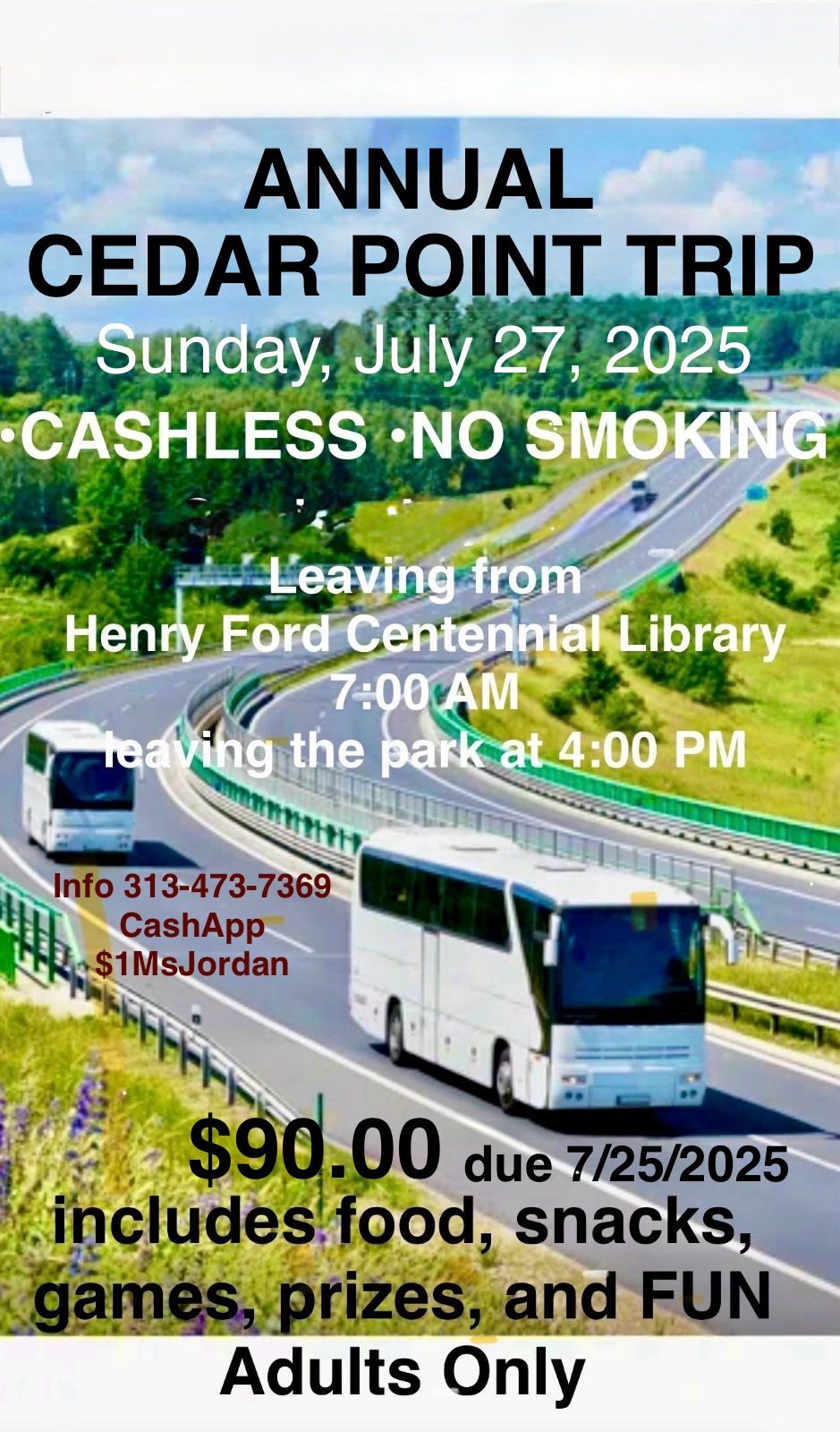 Get ready for a full day of thrills, fun, and memories as we hit the road for our annual Cedar Point trip! This adults-only adventure includes transportation, food, snacks, games, and prizes—all for just $90 (due by 7/25/2025 via CashApp: $1MsJordan).